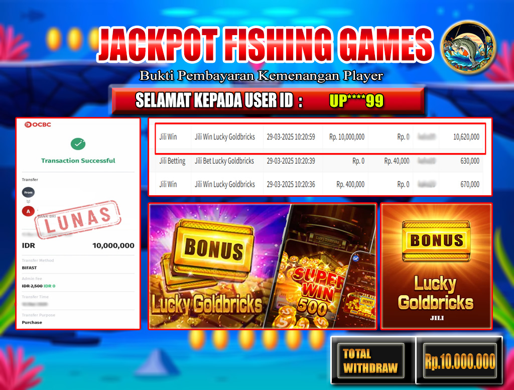 BRI303 JACKPOT FISHING GAMES : Selamat kepada User ID UP****99 telah berhasil memenangkan hadiah besar senilai Rp.10.000.000 di permainan JACKPOT FISHING GAMES JILI LUCKY GOLDBRICKS! Proses pencairan dana hanya memakan waktu 3-5 menit setelah pengisian formulir withdraw. Bukti pembayaran kami adalah SAH/VALID, langsung dari transaksi bank tujuan pemenang.