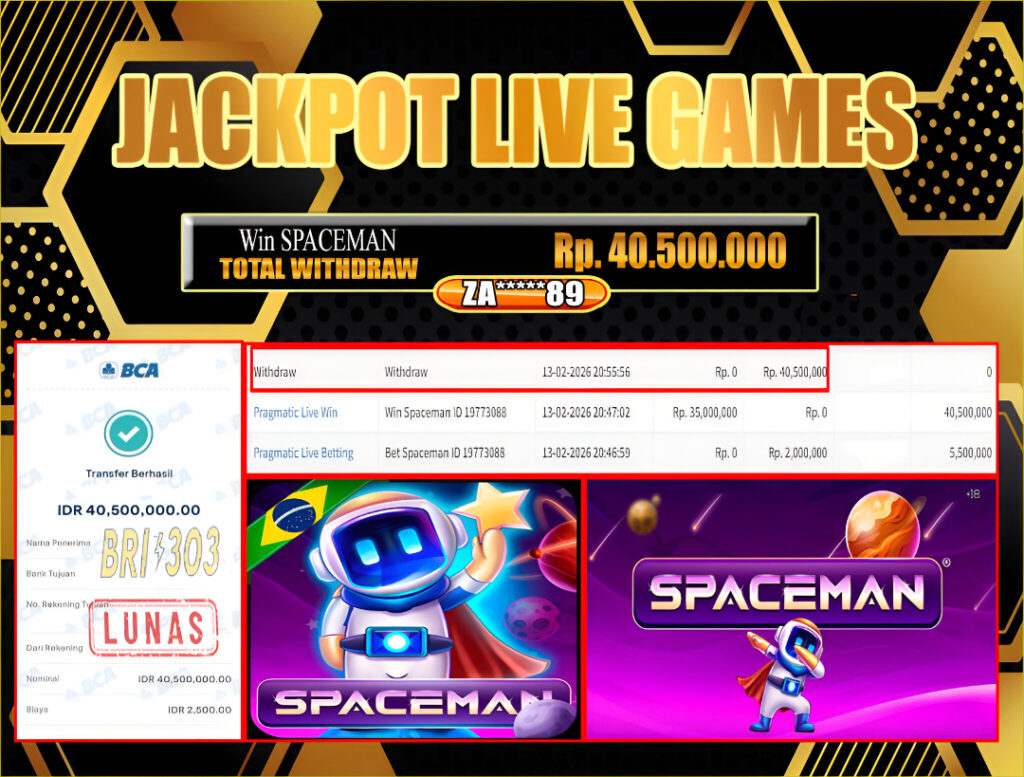 BRI303 JACKPOT LIVE GAMES : Selamat kepada User ID:ZA*****89 telah berhasil memenangkan hadiah besar senilai Rp.40.500.000 di permainan JACKPOT LIVE GAMES : SPACEMAN ! Proses pencairan dana hanya memakan waktu 3-5 menit setelah pengisian formulir withdraw. Bukti pembayaran kami adalah SAH/VALID, langsung dari transaksi bank tujuan pemenang.