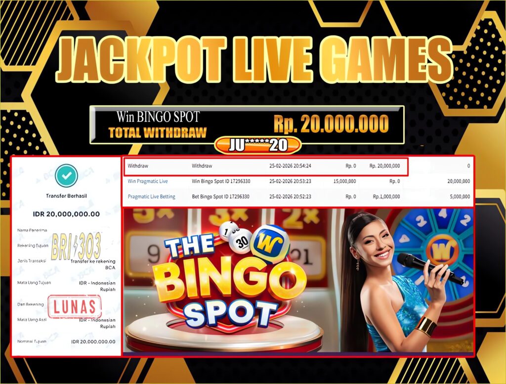 BRI303 JACKPOT LIVE GAMES : Selamat kepada User ID:JU*****20 telah berhasil memenangkan hadiah besar senilai Rp.20.000.000 di permainan JACKPOT LIVE GAMES : THE BINGO SPOT! Proses pencairan dana hanya memakan waktu 3-5 menit setelah pengisian formulir withdraw. Bukti pembayaran kami adalah SAH/VALID, langsung dari transaksi bank tujuan pemenang.