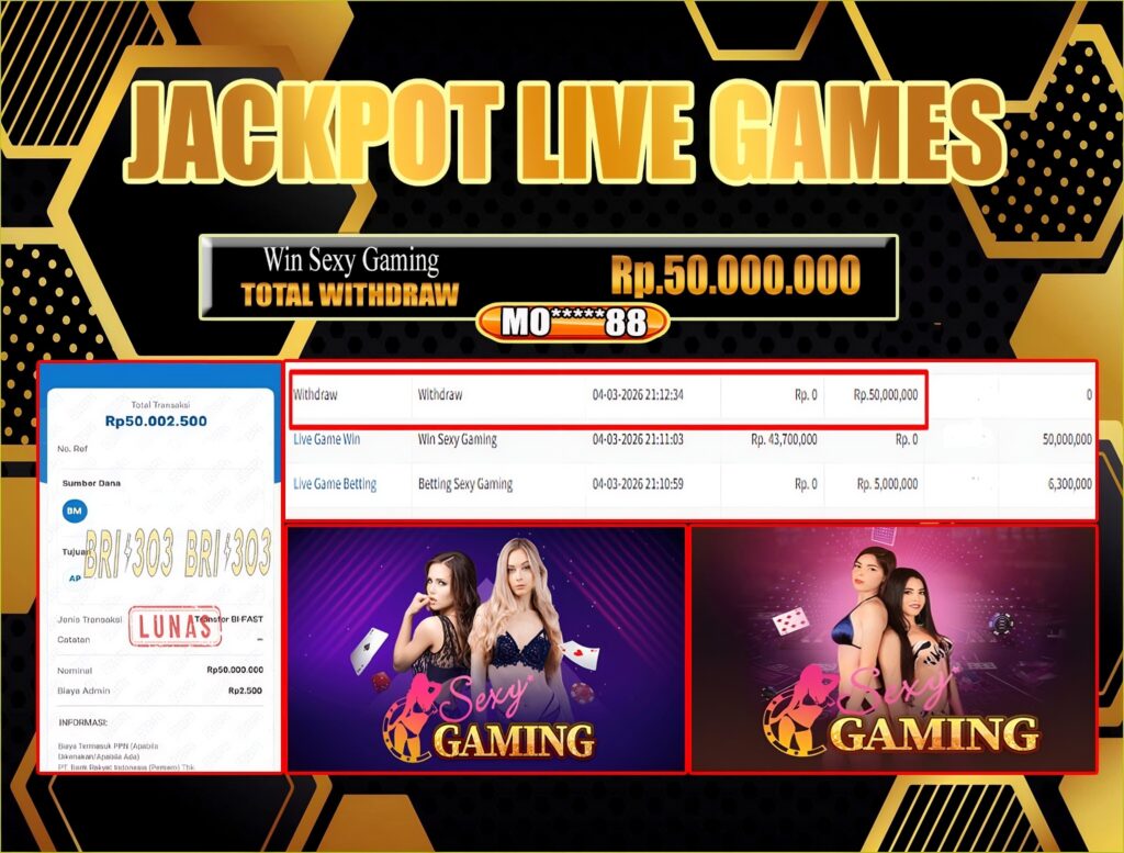 BRI303 JACKPOT LIVE GAMES : Selamat kepada User ID:MO*****88 telah berhasil memenangkan hadiah besar senilai Rp.50.000.000 di permainan JACKPOT LIVE GAMES : SEXY GAMING ! Proses pencairan dana hanya memakan waktu 3-5 menit setelah pengisian formulir withdraw. Bukti pembayaran kami adalah SAH/VALID, langsung dari transaksi bank tujuan pemenang.