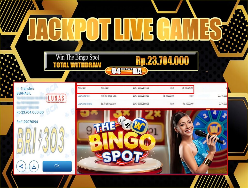 BRI303 JACKPOT LIVE GAMES : Selamat kepada User ID: 04*****RA telah berhasil memenangkan hadiah besar senilai Rp.23.704.000 di permainan JACKPOT LIVE GAMES : THE BINGO SPOT ! Proses pencairan dana hanya memakan waktu 3-5 menit setelah pengisian formulir withdraw. Bukti pembayaran kami adalah SAH/VALID, langsung dari transaksi bank tujuan pemenang.