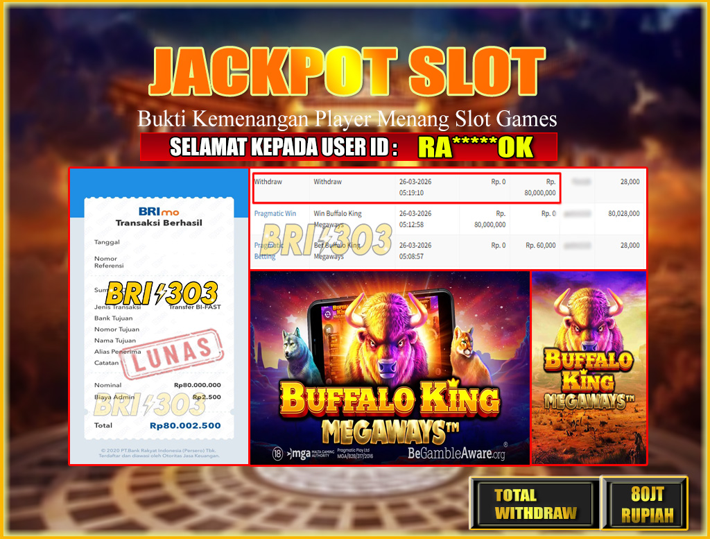 BRI303 JACKPOT SLOT GAMES : Selamat kepada User ID: RA*****OK telah berhasil memenangkan hadiah besar senilai Rp.80.000.000  di permainan JACKPOT SLOT GAMES: BUFFALO KING MEGAWAYS! Proses pencairan dana hanya memakan waktu 3-5 menit setelah pengisian formulir withdraw. Bukti pembayaran kami adalah SAH/VALID, langsung dari transaksi bank tujuan pemenang.