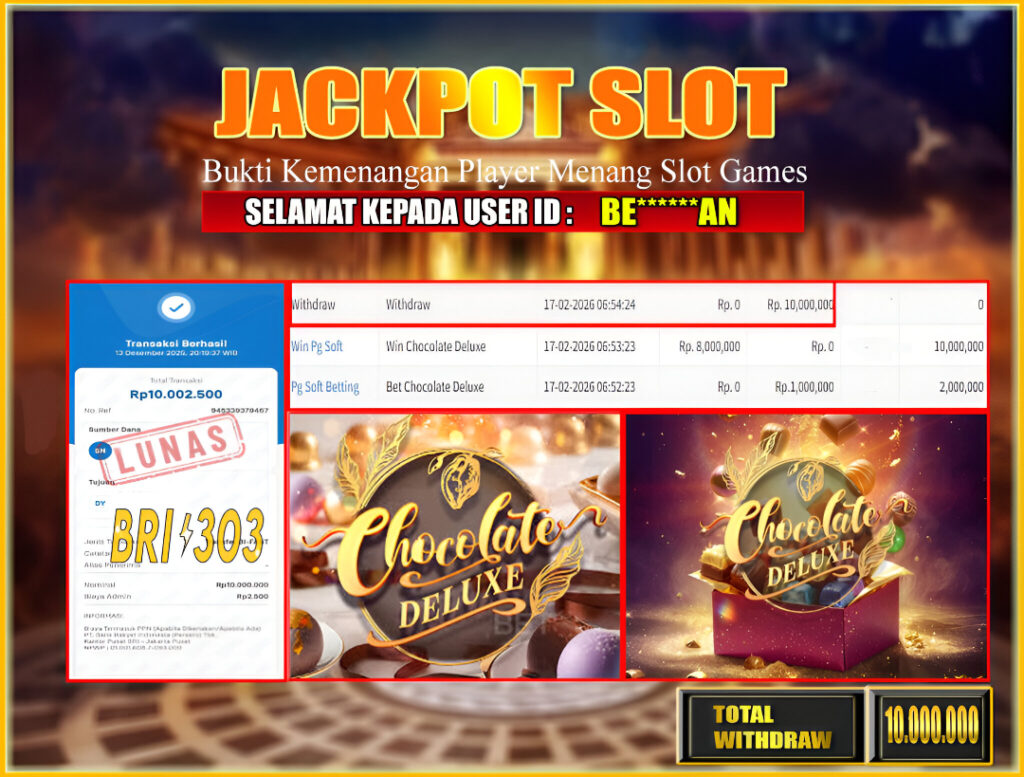 BRI303 JACKPOT SLOT GAMES : Selamat kepada User ID: BE*****AN telah berhasil memenangkan hadiah besar senilai Rp.10.000.000  di permainan JACKPOT SLOT GAMES: CHOCOLATE DELUXE ! Proses pencairan dana hanya memakan waktu 3-5 menit setelah pengisian formulir withdraw. Bukti pembayaran kami adalah SAH/VALID, langsung dari transaksi bank tujuan pemenang.