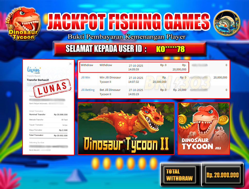 BRI303 JACKPOT FISHING GAMES : Selamat kepada User ID KO*****78 telah berhasil memenangkan hadiah besar senilai Rp.20.000.000 di permainan JACKPOT FISHING: DINOSAUR TYCOON II ! Proses pencairan dana hanya memakan waktu 3-5 menit setelah pengisian formulir withdraw. Bukti pembayaran kami adalah SAH/VALID, langsung dari transaksi bank tujuan pemenang.
