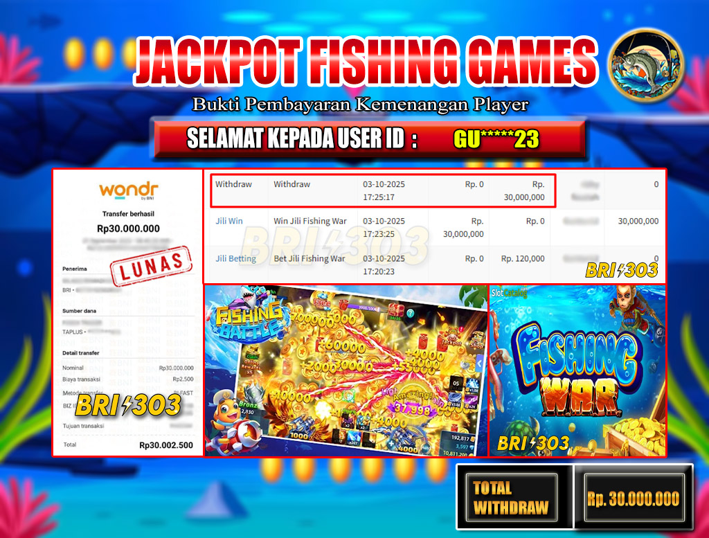 BRI303 JACKPOT FISHING GAMES 03 OKTOBER 2025 Rp.30.000.000,- LUNAS