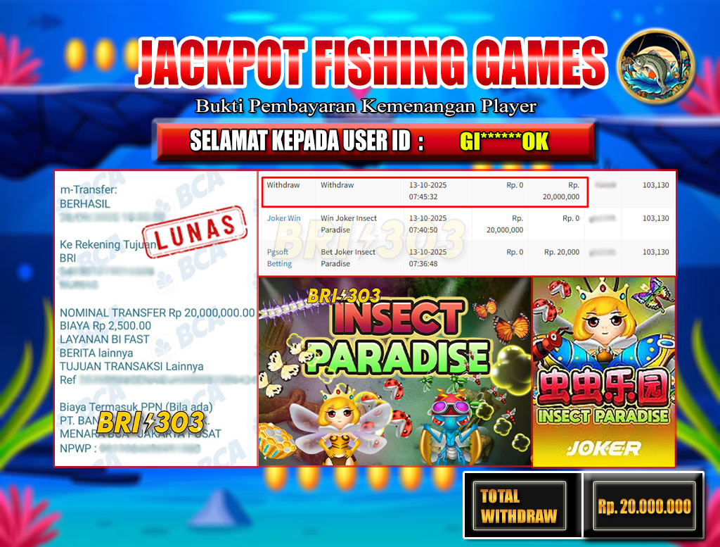BRI303 JACKPOT FISHING GAMES 13 OKTOBER 2025 Rp.20.000.000,- LUNAS