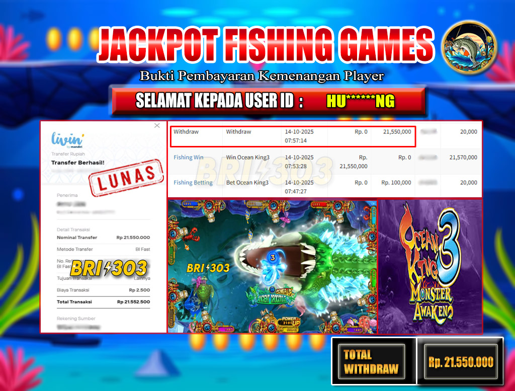 BRI303 JACKPOT FISHING GAMES 14 OKTOBER 2025 Rp.21.550.000,- LUNAS