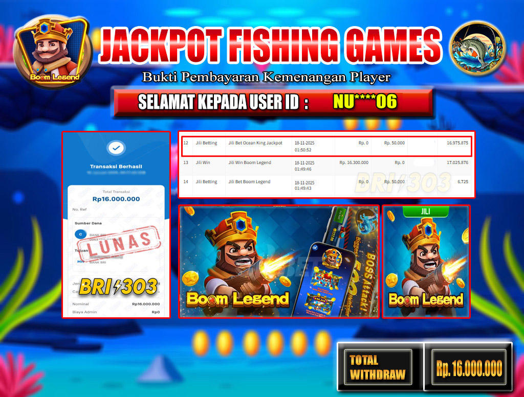 BRI303 JACKPOT FISHING GAMES : Selamat kepada User ID NU****06 telah berhasil memenangkan hadiah besar senilai Rp.16.000.000 di permainan JACKPOT FISHING GAMES: BOOM LEGEND! Proses pencairan dana hanya memakan waktu 3-5 menit setelah pengisian formulir withdraw. Bukti pembayaran kami adalah SAH/VALID, langsung dari transaksi bank tujuan pemenang.
