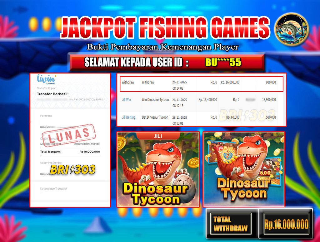 BRI303 JACKPOT FISHING GAMES 26 NOVEMBER 2025 Rp.16.000.000,- LUNAS