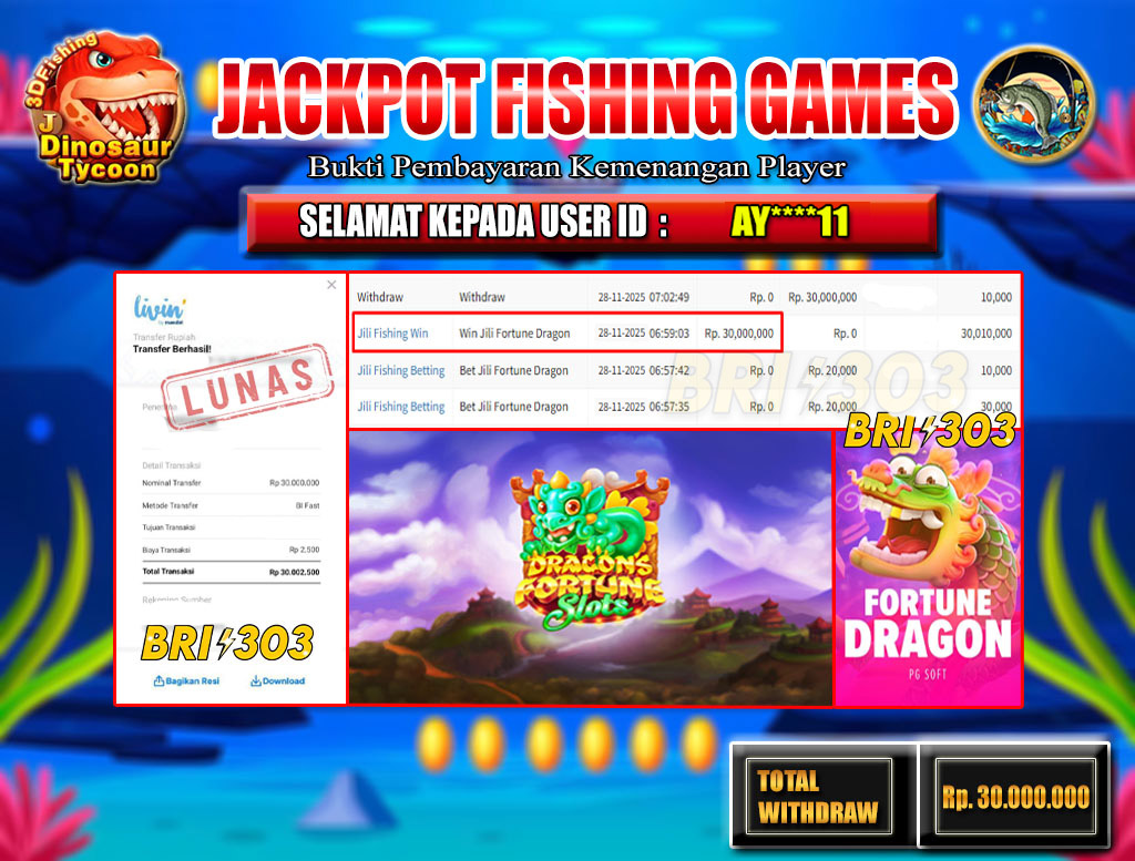 BRI303 JACKPOT FISHING GAMES 28 NOVEMBER 2025 Rp.30.000.000,- LUNAS