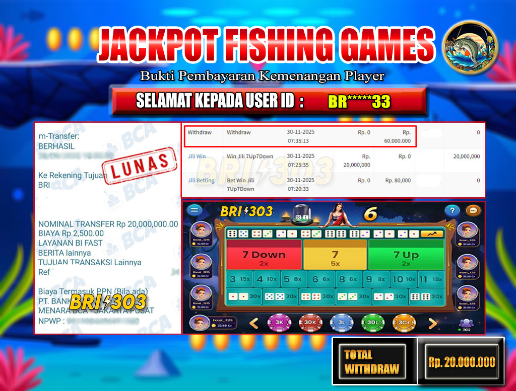 BRI303 JACKPOT FISHING GAMES 30 NOVEMBER 2025 Rp.20.000.000,- LUNAS