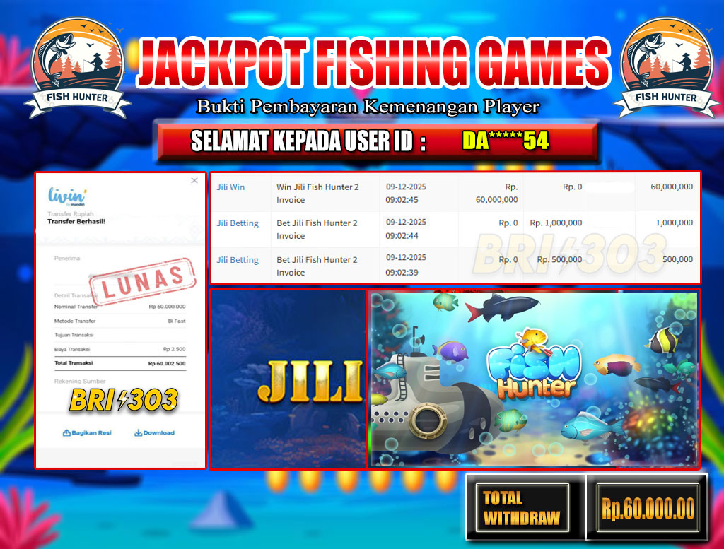 BRI303 JACKPOT FISHING GAMES 09 DESEMBER 2025 Rp.60.000.000,- LUNAS