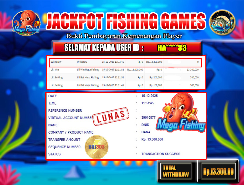 BRI303 JACKPOT FISHING GAMES 15 DESEMBER 2025 Rp.13.300.000,- LUNAS