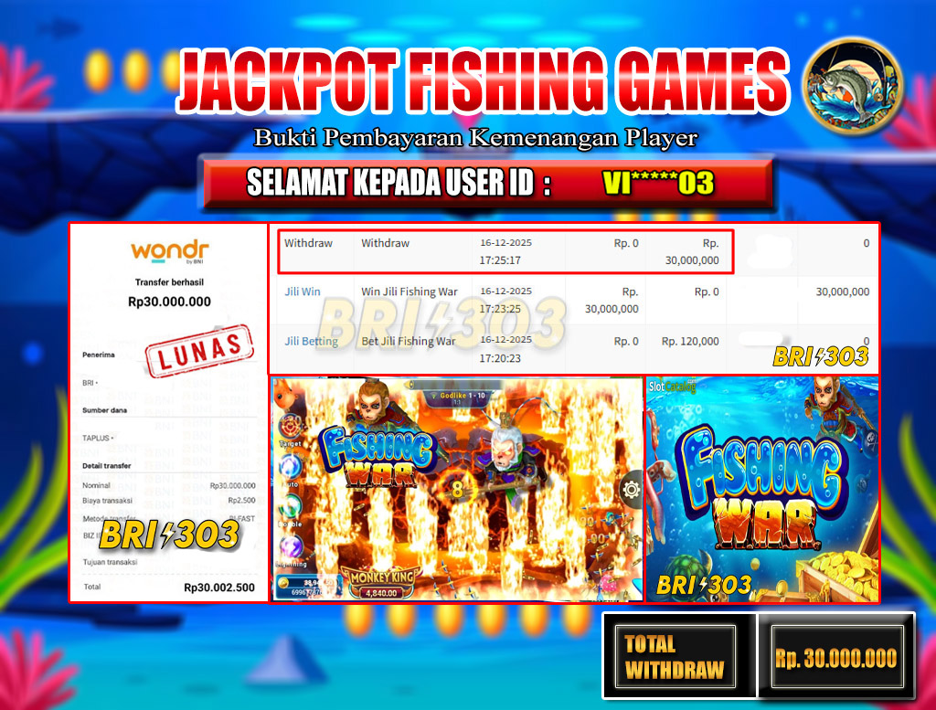 BRI303 JACKPOT FISHING GAMES 16 DESEMBER 2025 Rp.30.000.000,- LUNAS