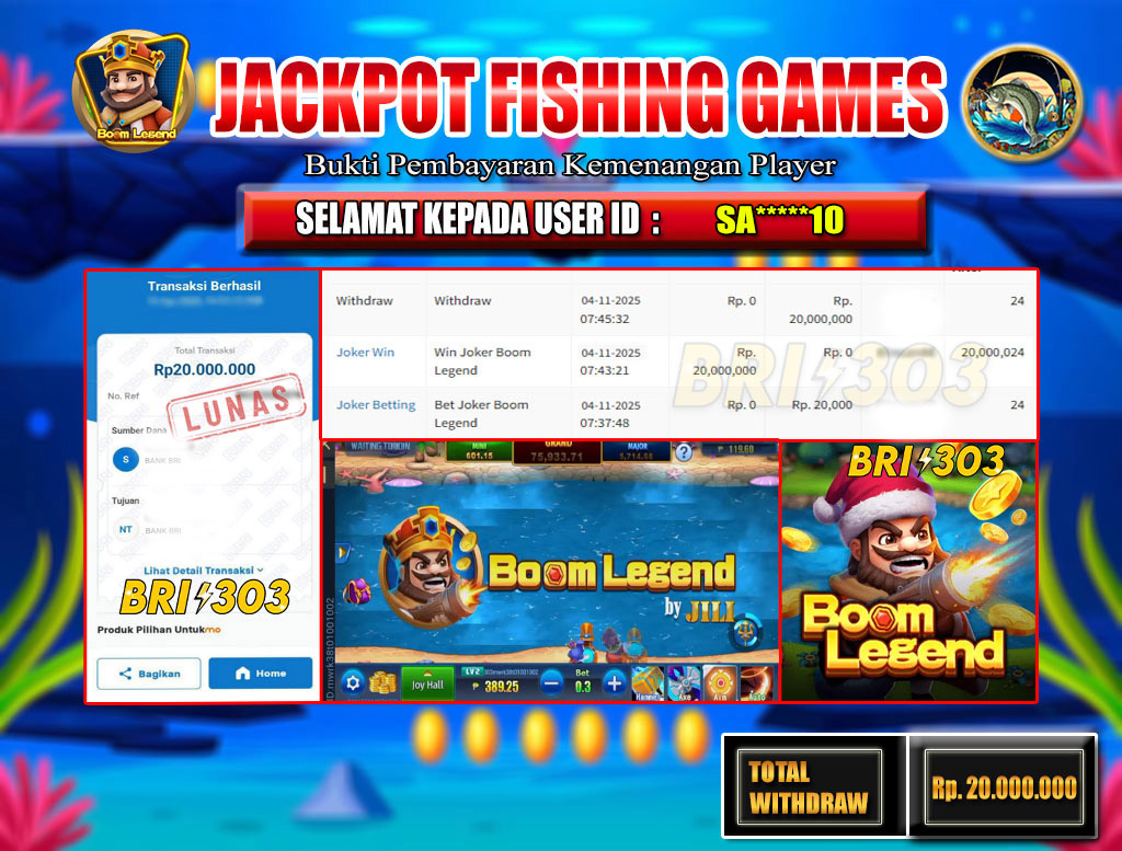 BRI303 JACKPOT FISHING GAMES Selamat kepada User ID SA****10 telah berhasil memenangkan hadiah besar senilai Rp.20.000.000 di permainan JACKPOT FISHING GAMES: BOOM LEGEND! Proses pencairan dana hanya memakan waktu 3-5 menit setelah pengisian formulir withdraw. Bukti pembayaran kami adalah SAH/VALID, langsung dari transaksi bank tujuan pemenang.