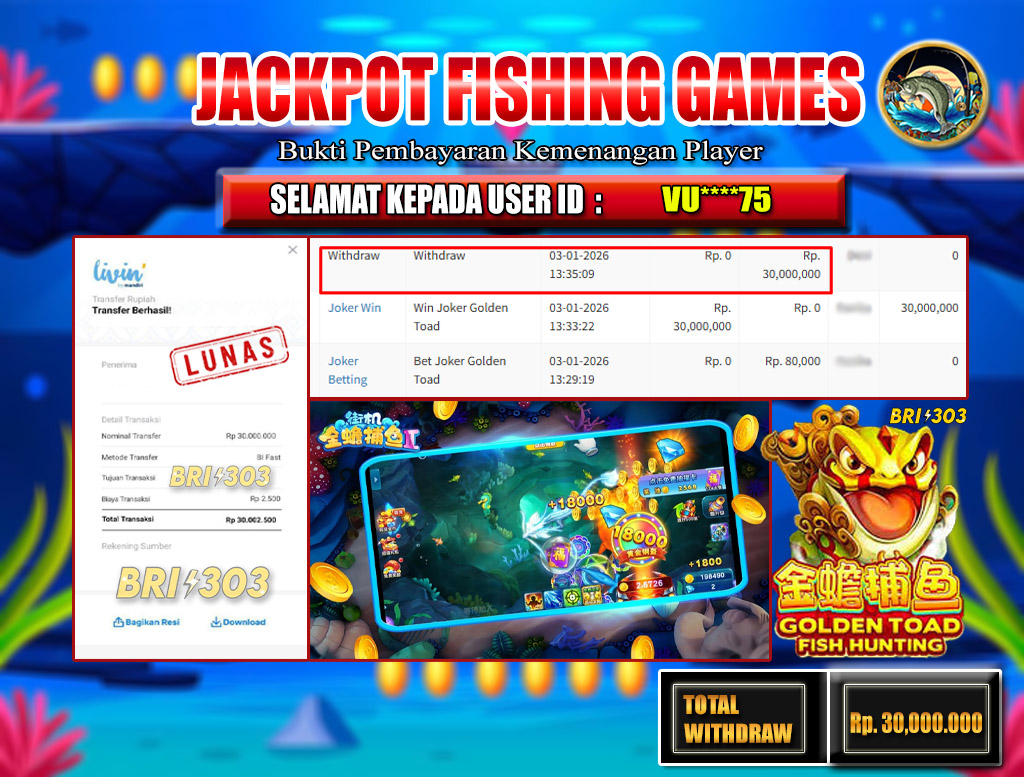 BRI303 JACKPOT SLOT GAMES : Selamat kepada User ID: VU****75 telah berhasil memenangkan hadiah besar senilai Rp.30,000.000 di permainan JACKPOT FISHING GAMES: GOLDEN TOAD! Proses pencairan dana hanya memakan waktu 3-5 menit setelah pengisian formulir withdraw. Bukti pembayaran kami adalah SAH/VALID, langsung dari transaksi bank tujuan pemenang.