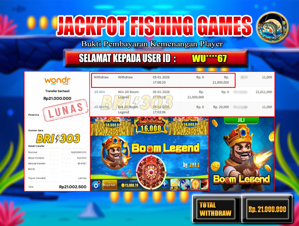 BRI303 JACKPOT SLOT GAMES : Selamat kepada User ID: WU****67  telah berhasil memenangkan hadiah besar senilai Rp.21,000.000 di permainan JACKPOT FISHING GAMES: BOOM LEGEND! Proses pencairan dana hanya memakan waktu 3-5 menit setelah pengisian formulir withdraw. Bukti pembayaran kami adalah SAH/VALID, langsung dari transaksi bank tujuan pemenang.