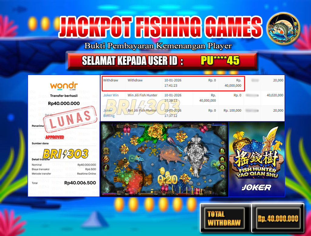BRI303 JACKPOT SLOT GAMES : Selamat kepada User ID: PU****45  telah berhasil memenangkan hadiah besar senilai Rp.40,000.000 di permainan JACKPOT FISHING GAMES: FISH HUNTER YAO QIAN SHUH! Proses pencairan dana hanya memakan waktu 3-5 menit setelah pengisian formulir withdraw. Bukti pembayaran kami adalah SAH/VALID, langsung dari transaksi bank tujuan pemenang.