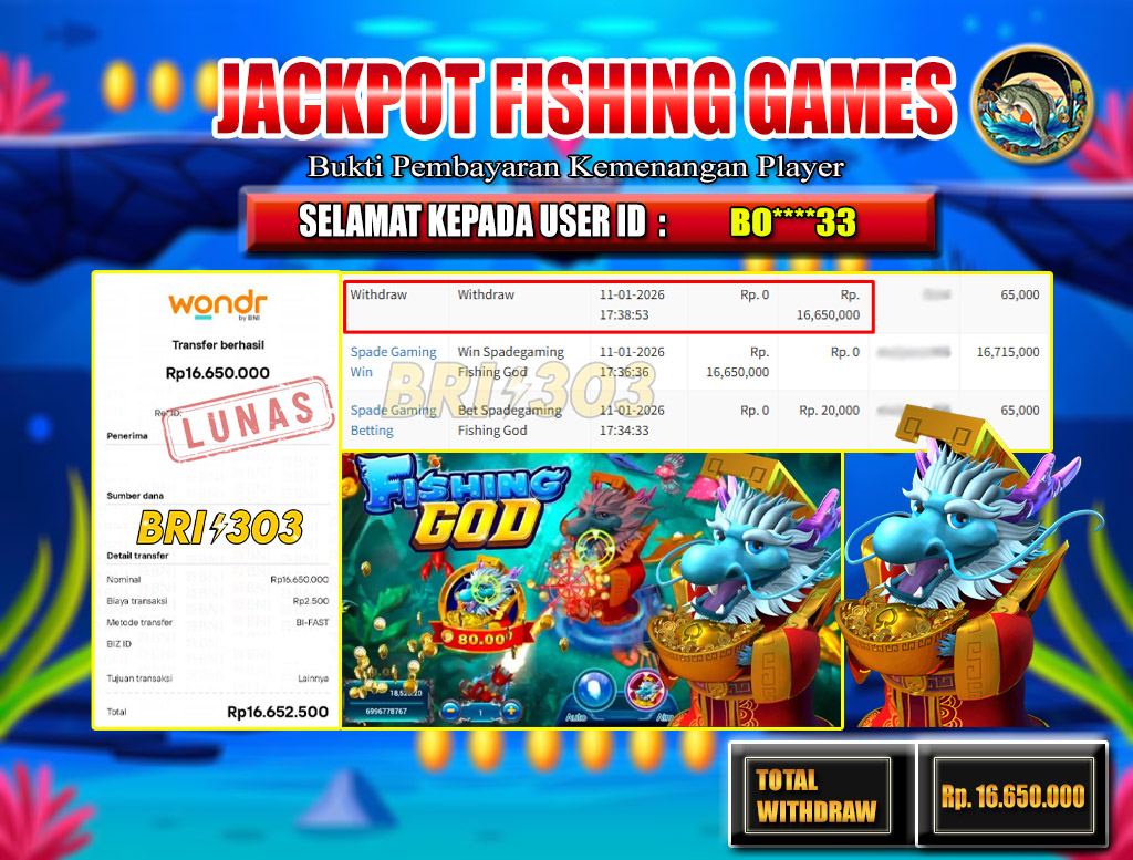 BRI303 JACKPOT FISHING GAMES 11 JANUARI 2026 Rp.13.300.000,- LUNAS