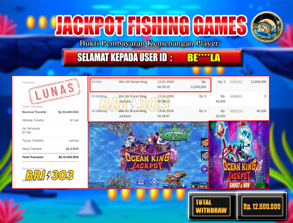 BRI303 JACKPOT FISHING GAMES 13 JANUARI 2026 Rp.12,600.000,- LUNAS