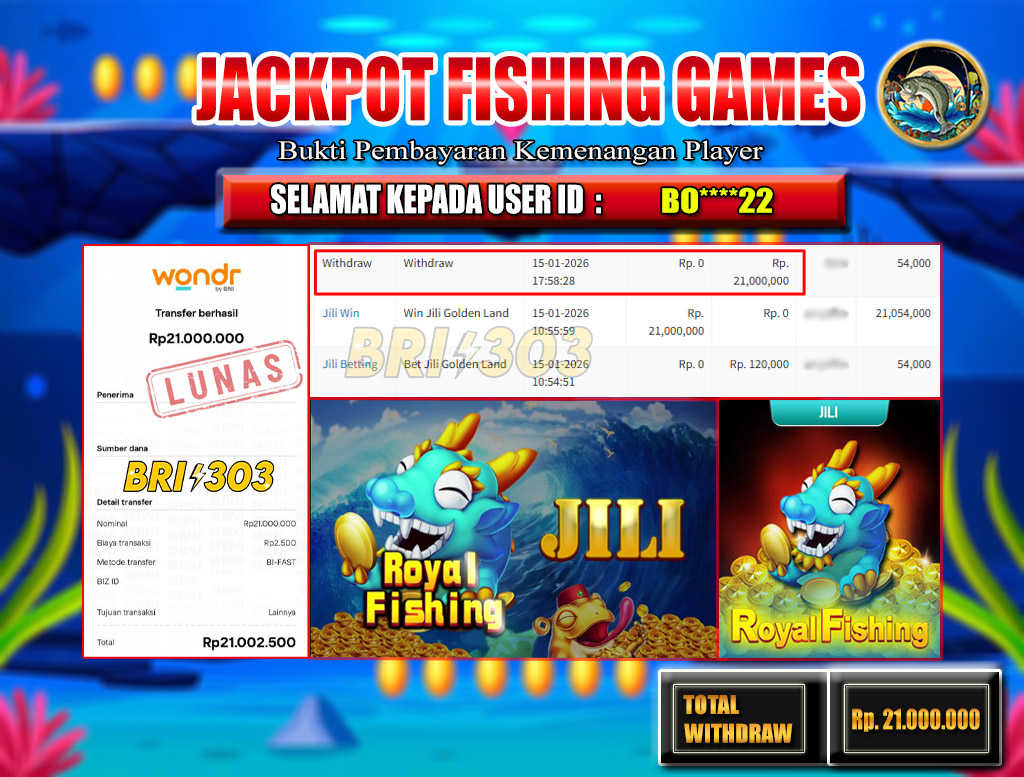 BRI303 JACKPOT FISHING GAMES 15 JANUARI 2026 Rp.21,000.000,- LUNAS