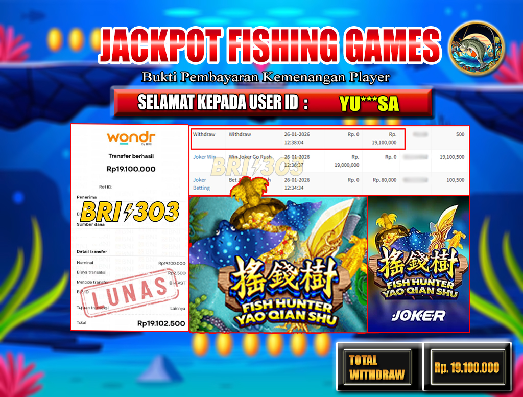 BRI303 JACKPOT FISHING GAMES 26 JANUARI 2026 Rp.19.100.000,- LUNAS