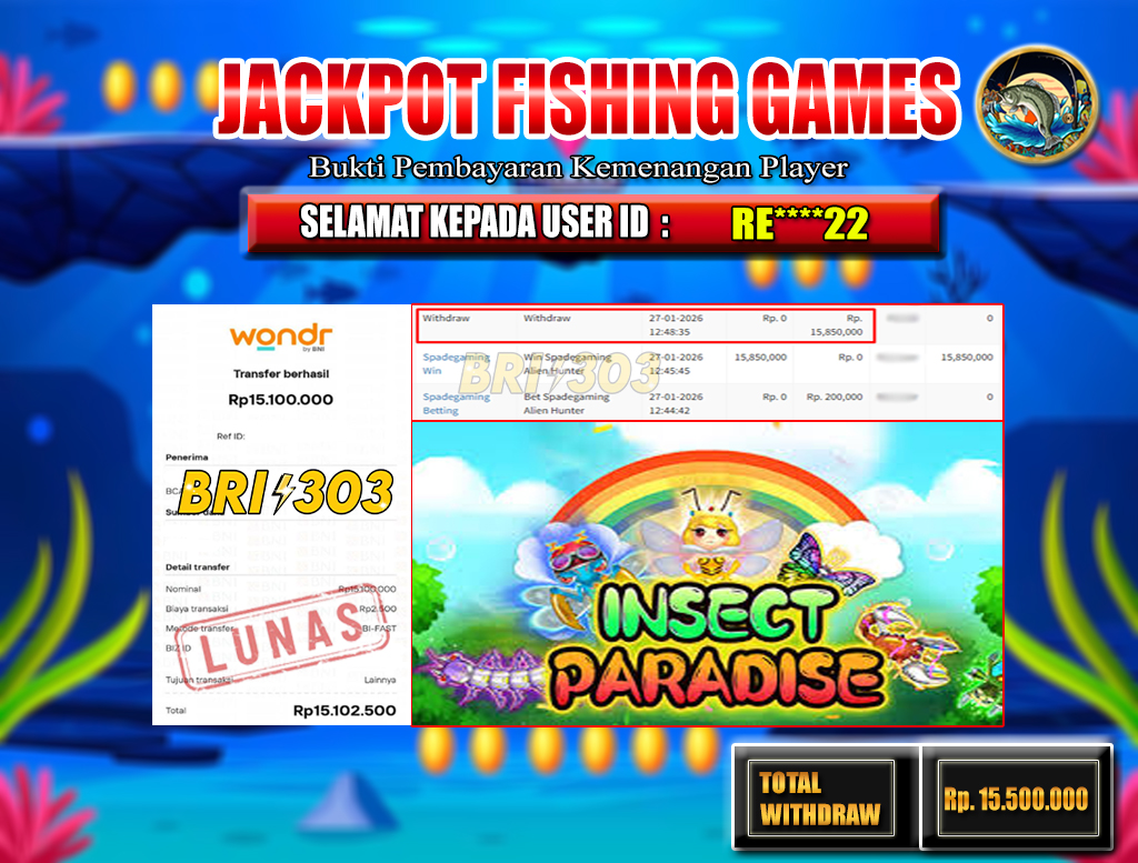 BRI303 JACKPOT FISHING GAMES 28 JANUARI 2026 Rp.15.500.000,- LUNAS