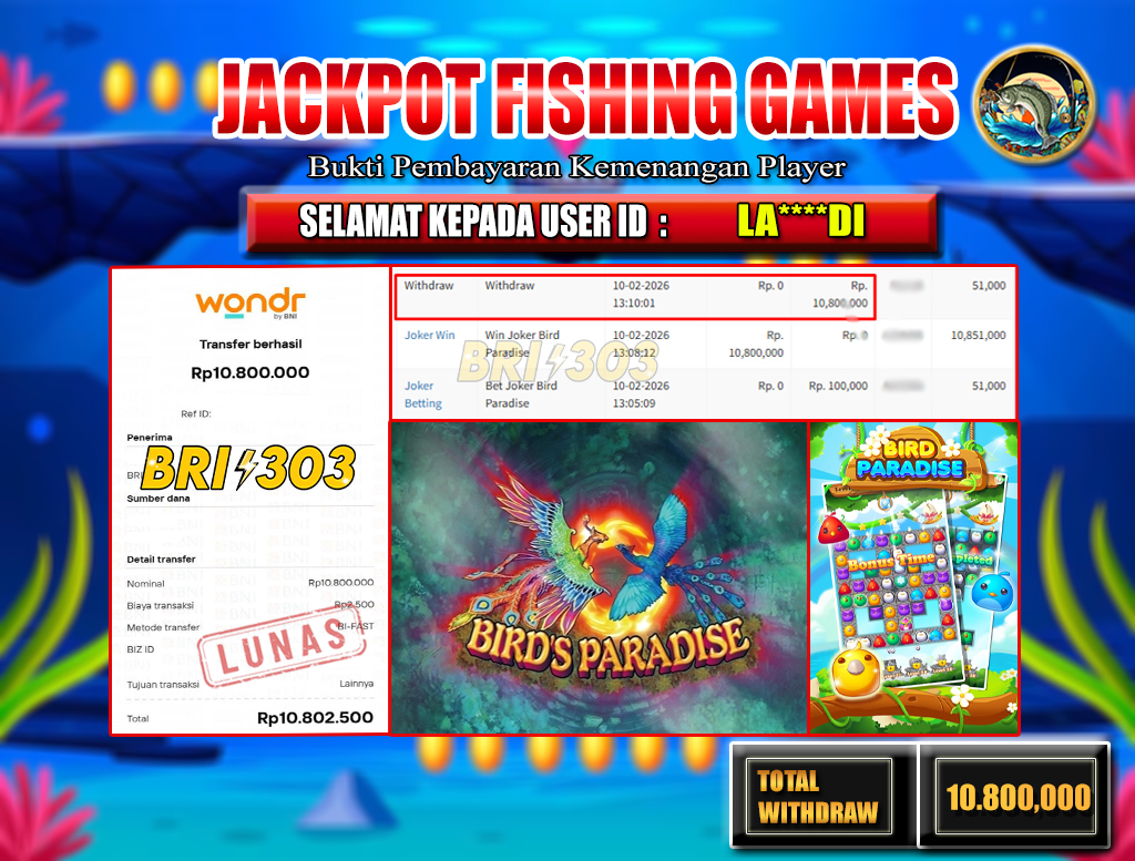 BRI303 JACKPOT FISHING GAMES 10 FEBRUARI 2026 Rp.10,800.000,- LUNAS