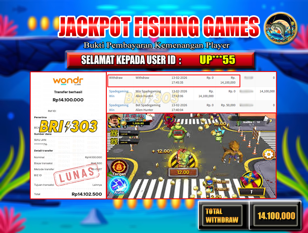 BRI303 JACKPOT FISHING GAMES 13 FEBRUARI 2026 Rp.14,100.000,- LUNAS