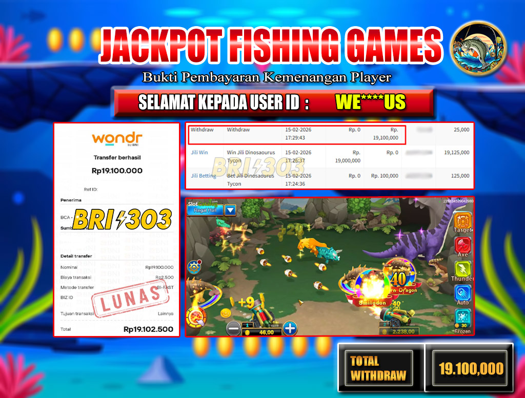 BRI303 JACKPOT FISHING GAMES 15 FEBRUARI 2026 Rp.19,100.000,- LUNAS