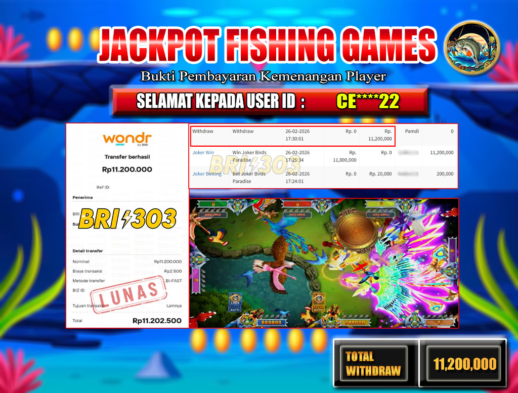 BRI303 JACKPOT FISHING GAMES 26 FEBRUARI 2026 Rp.11.200.000,- LUNAS