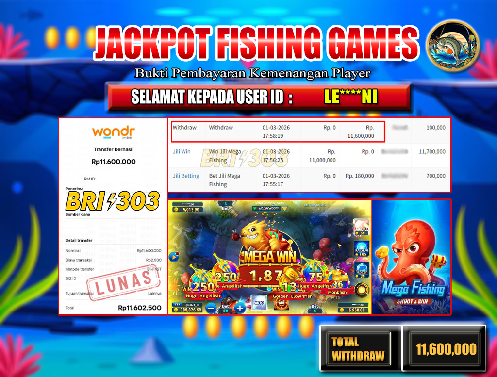 BRI303 JACKPOT FISHING GAMES 01 MARET 2026 Rp.11.600.000,- LUNAS