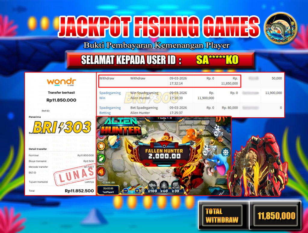 BRI303 JACKPOT FISHING GAMES 09 MARET 2026 Rp.11.850.000,- LUNAS