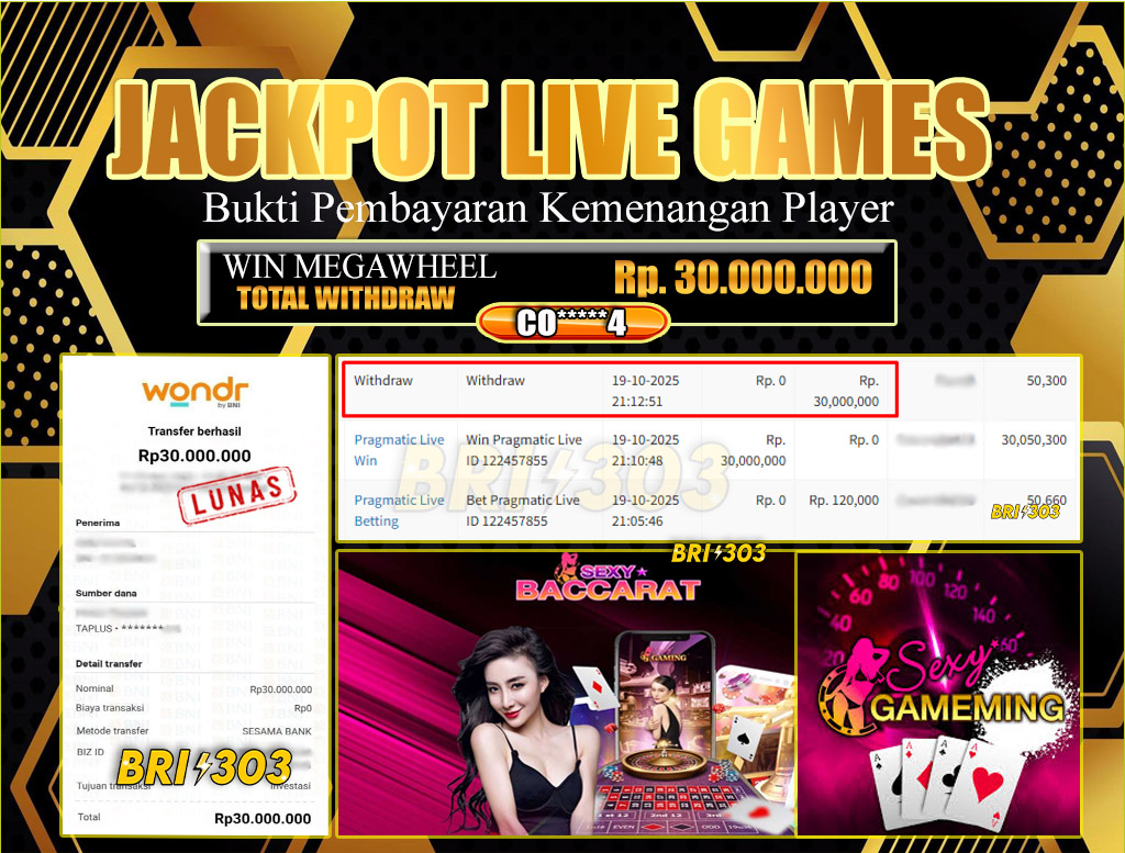 BRI303 JACKPOT LIVE GAMES 19 OKTOBER 2025 Rp. 30.000.000,- LUNAS