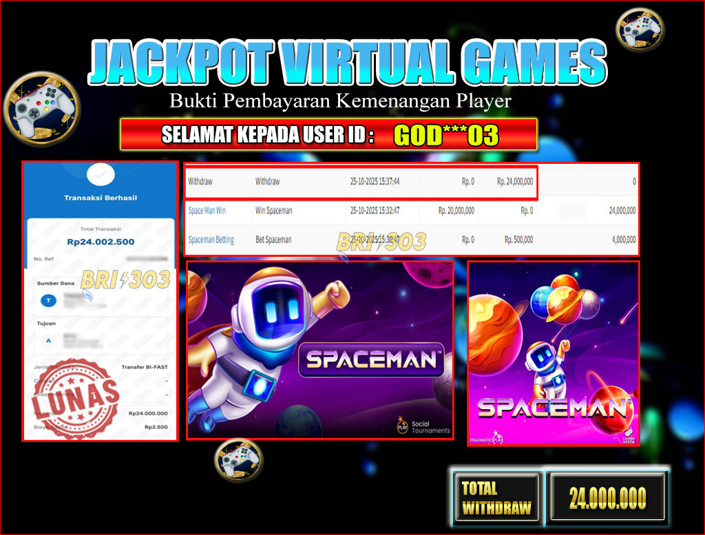 BRI303 JACKPOT LIVE GAMES : Selamat kepada User ID:GOD***03 telah berhasil memenangkan hadiah besar senilai Rp.24.000.000 di permainan JACKPOT LIVE GAMES : SPACEMAN! Proses pencairan dana hanya memakan waktu 3-5 menit setelah pengisian formulir withdraw. Bukti pembayaran kami adalah SAH/VALID, langsung dari transaksi bank tujuan pemenang.