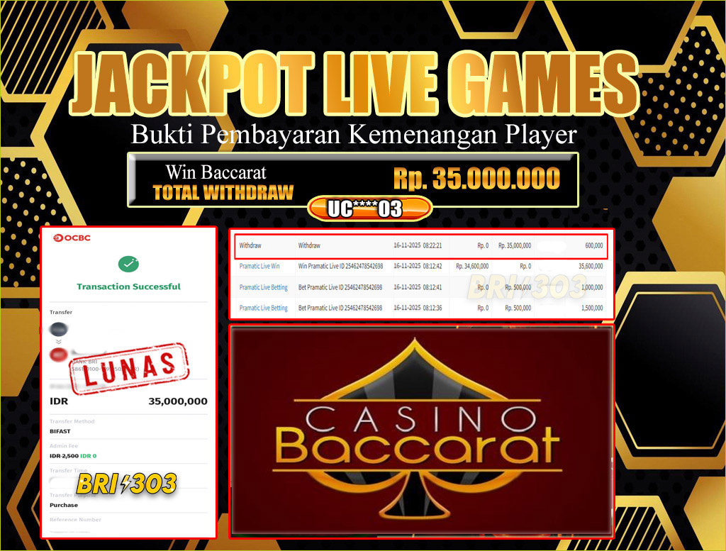 BRI303 JACKPOT LIVE GAMES : Selamat kepada User ID: UC****03 telah berhasil memenangkan hadiah besar senilai Rp.35.000.000 di permainan JACKPOT LIVE GAMES : BACCARAT! Proses pencairan dana hanya memakan waktu 3-5 menit setelah pengisian formulir withdraw. Bukti pembayaran kami adalah SAH/VALID, langsung dari transaksi bank tujuan pemenang.