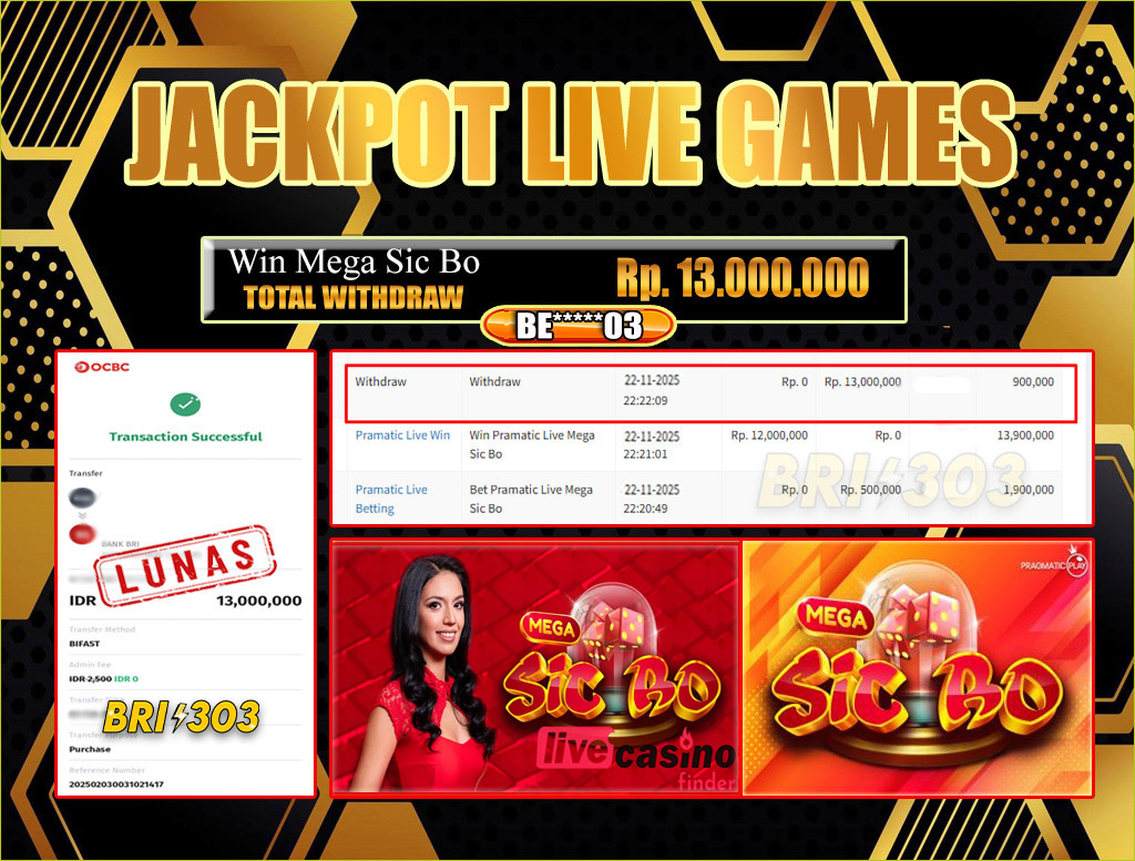 BRI303 JACKPOT LIVE GAMES 22 NOVEMBER 2025 Rp. 13.000.000,- LUNAS