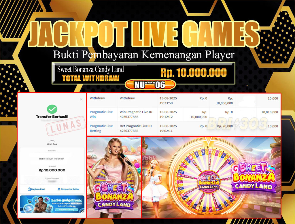 BRI303 JACKPOT LIVE GAMES : Selamat kepada User ID: NU****06 telah berhasil memenangkan hadiah besar senilai Rp.10.000.000 di permainan JACKPOT LIVE GAMES : SWEET BONANZA CANDY LAND! Proses pencairan dana hanya memakan waktu 3-5 menit setelah pengisian formulir withdraw. Bukti pembayaran kami adalah SAH/VALID, langsung dari transaksi bank tujuan pemenang.