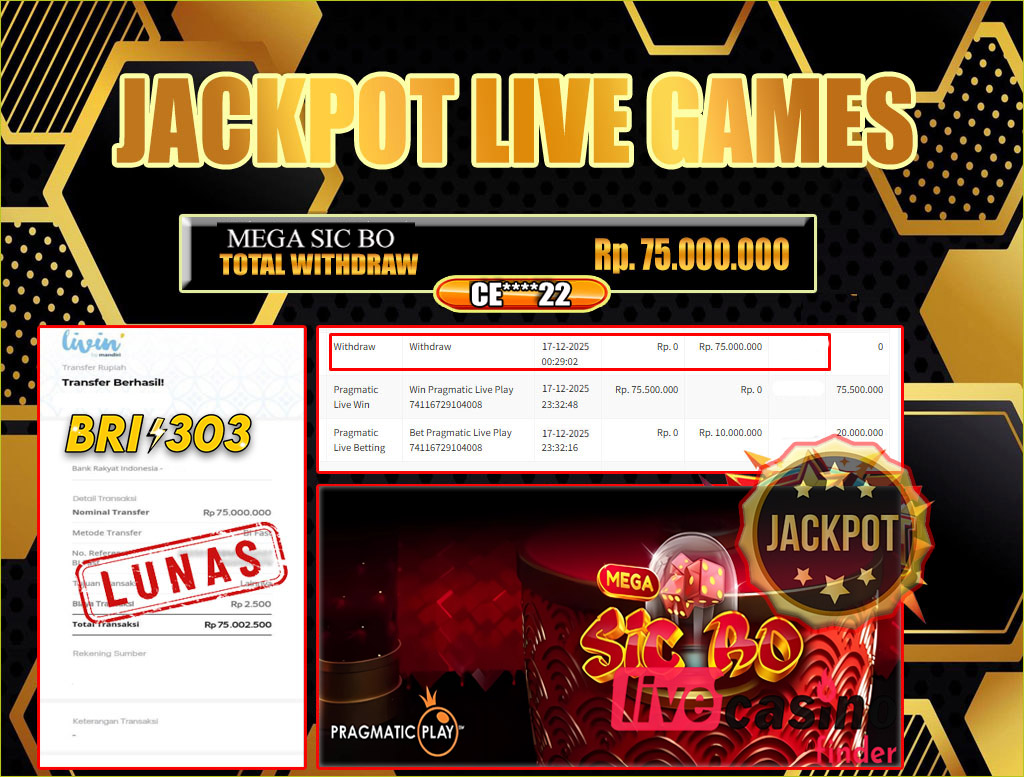 BRI303 JACKPOT LIVE GAMES 17 DESEMBER 2025 Rp. 75.000.000,- LUNAS