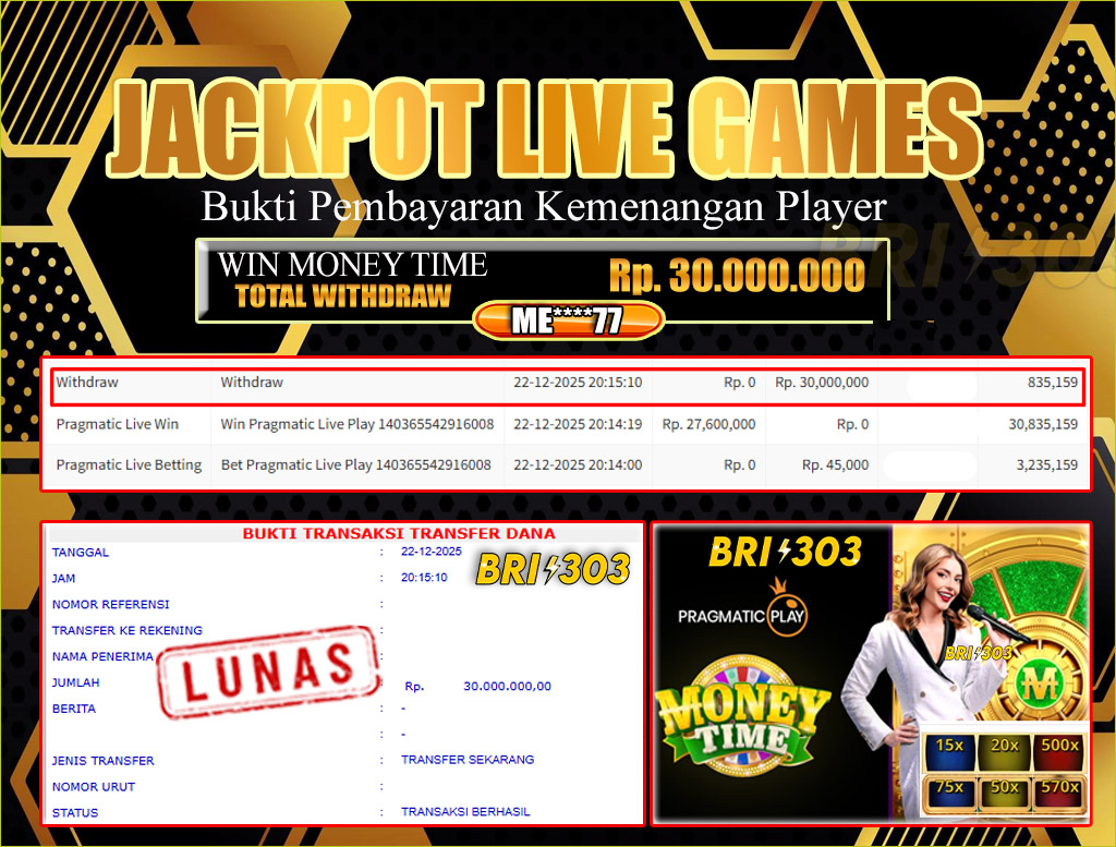 BRI303 JACKPOT LIVE GAMES 22 DESEMBER 2025 Rp. 30.000.000,- LUNAS