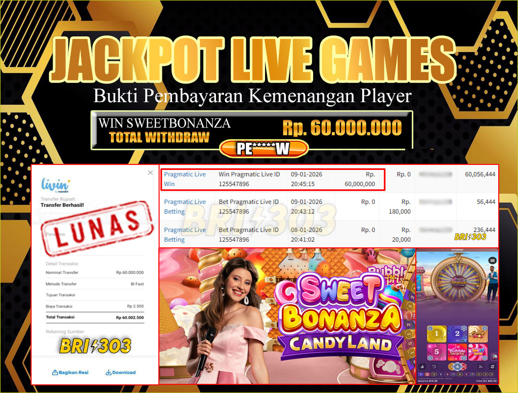 BRI303 JACKPOT LIVE GAMES : Selamat kepada User ID: PE****W telah berhasil memenangkan hadiah besar senilai Rp.60,000.000 di permainan JACKPOT LIVE GAMES : SWEETBONANZA! Proses pencairan dana hanya memakan waktu 3-5 menit setelah pengisian formulir withdraw. Bukti pembayaran kami adalah SAH/VALID, langsung dari transaksi bank tujuan pemenang.