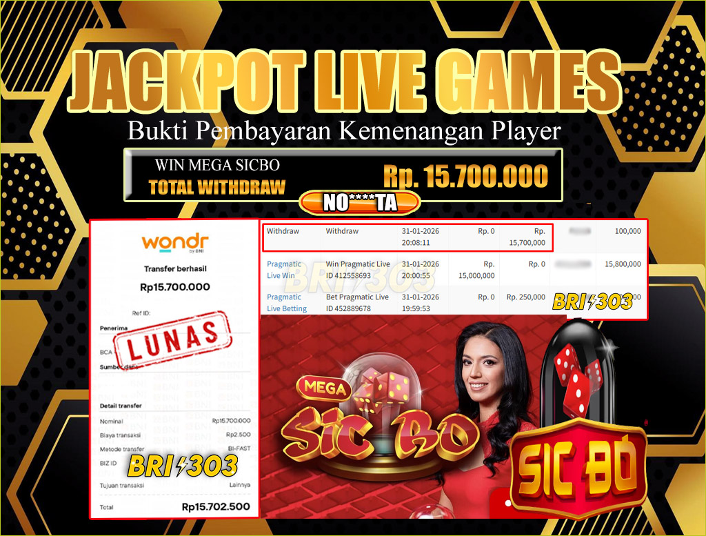 BRI303 JACKPOT LIVE GAMES 31 JANUARI 2026 Rp.15,700,000,- LUNAS