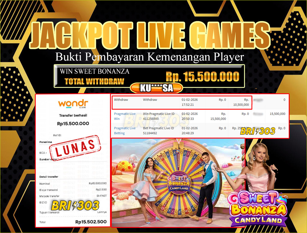 BRI303 JACKPOT LIVE GAMES 01 FEBRUARI 2026 Rp.15,500,000,- LUNAS