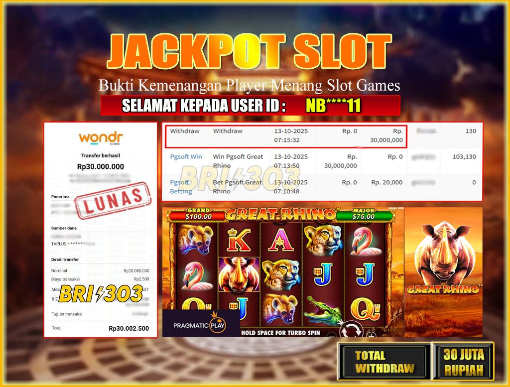 BRI303 JACKPOT SLOT GAMES 13/10/2025 Rp.30,000,000,- LUNAS