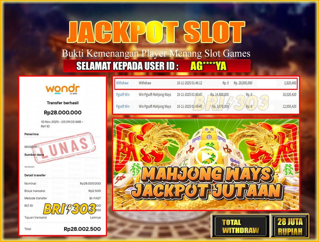 BRI303 JACKPOT SLOT GAMES 10 NOVEMBER 2025 Rp.28,000,000,- LUNAS