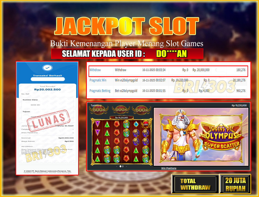 BRI303 JACKPOT SLOT GAMES 16 NOVEMBER 2025 Rp.20,000,000,- LUNAS