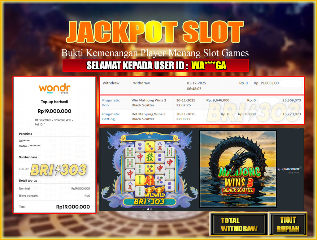 BRI303 JACKPOT SLOT GAMES 30 NOVEMBER 2025 Rp.19,000,000,- LUNAS