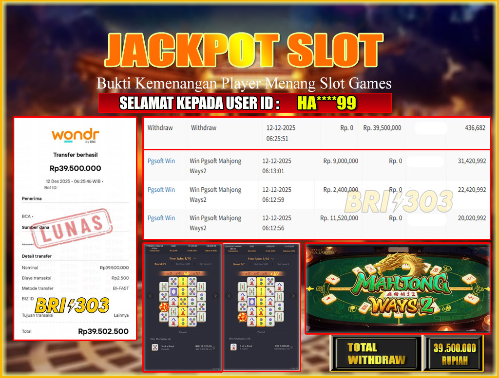 BRI303 JACKPOT SLOT GAMES 12 DESEMBER 2025 Rp.39,500,000,- LUNAS