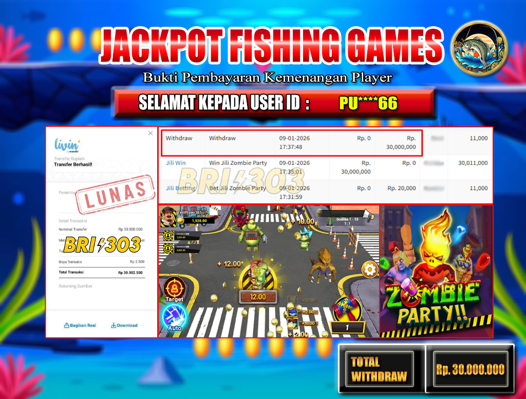 BRI303 JACKPOT SLOT GAMES : Selamat kepada User ID: PU****66  telah berhasil memenangkan hadiah besar senilai Rp.30,000.000 di permainan JACKPOT FISHING GAMES: ZOMBIE PARTY! Proses pencairan dana hanya memakan waktu 3-5 menit setelah pengisian formulir withdraw. Bukti pembayaran kami adalah SAH/VALID, langsung dari transaksi bank tujuan pemenang.
