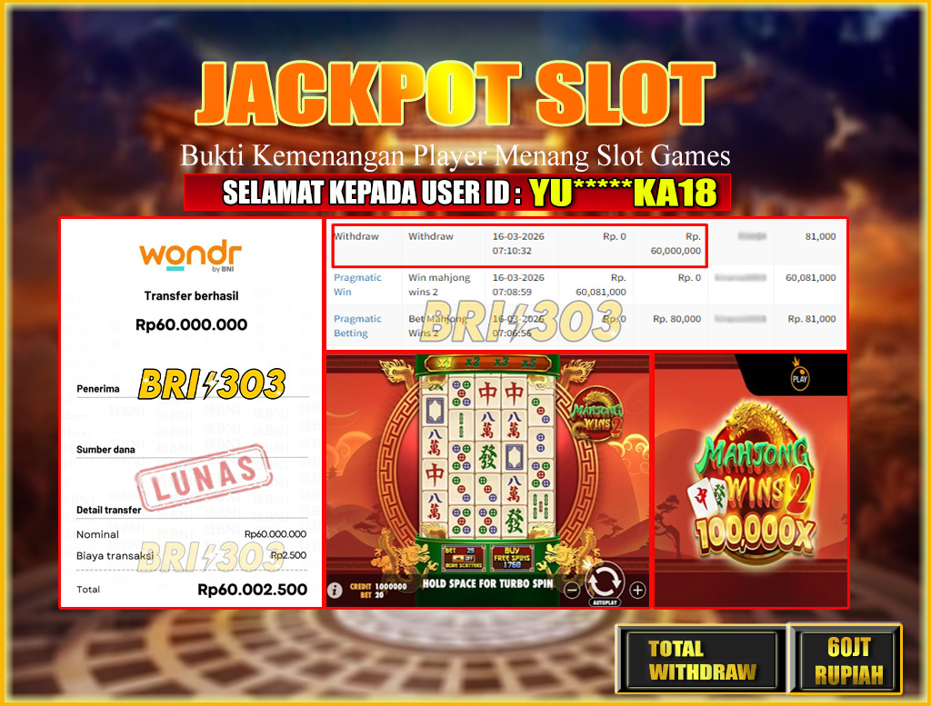 BRI303 JACKPOT SLOT GAMES 16 MARET 2026 Rp.60,000,000,- LUNAS